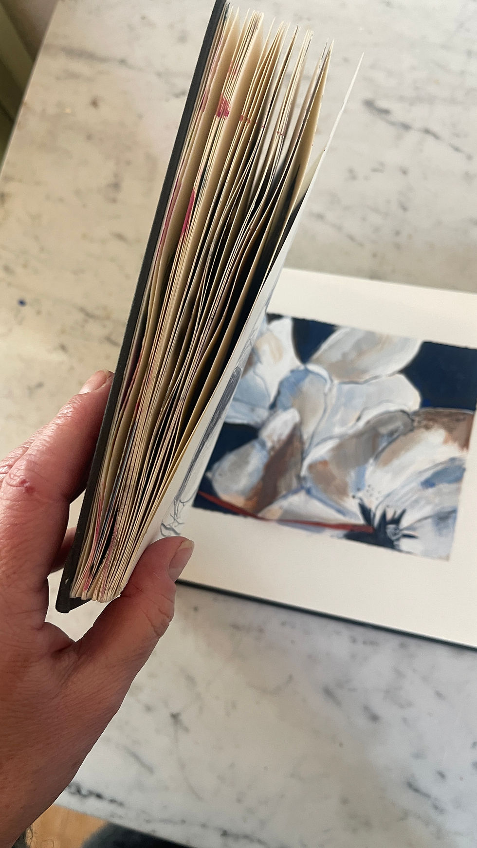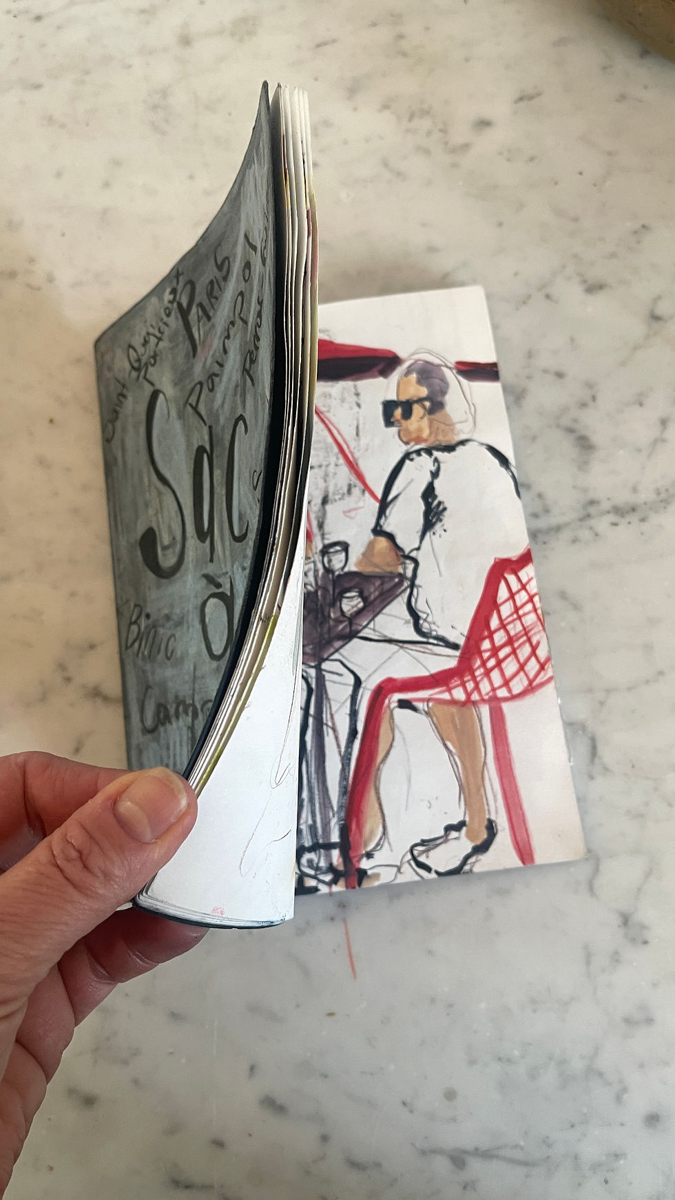 Manchmal halte ich darin eine Landschaft fest, manchmal schreibe ich nur ein paar Worte auf. Manchmal entsteht eine kleine Skizze, manchmal klebe ich einfach ein Stück Papier ein, das mir unterwegs begegnet ist.